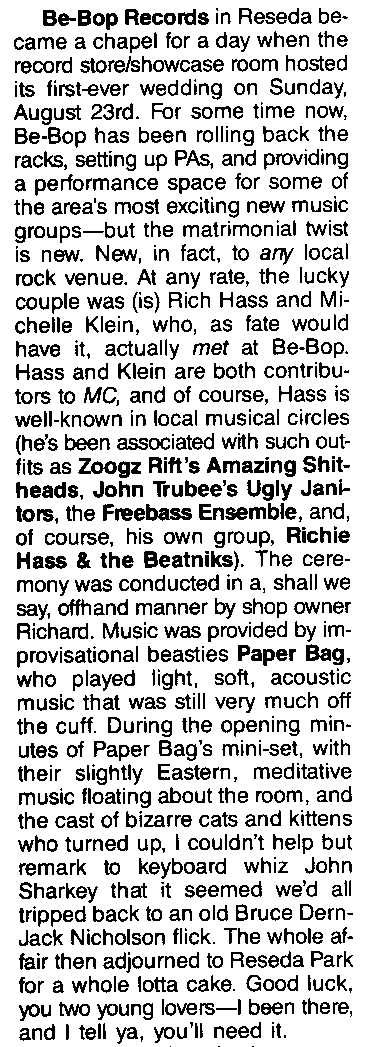 RICHIE HASS & MICHELLE KLEIN WEDDING, LIVE @ BE-BOP RECORDS