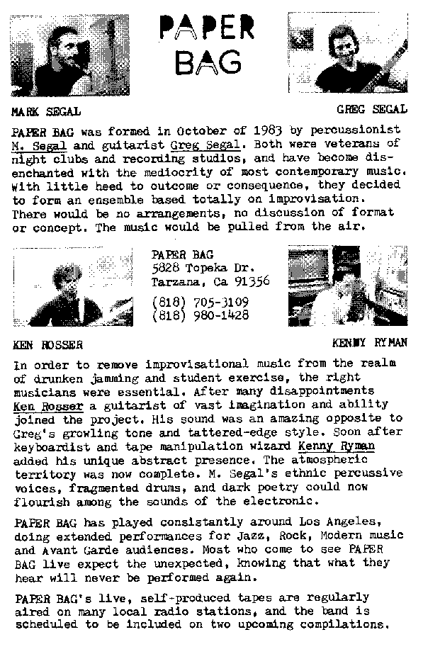This was a project by Tony Thijssen, drummer of the jazz fusion band Earthshine. I think he heard us at Be-Bop Records but I don't recall for sure how he found us. He was putting together this compilation of bands from the west San Fernando Valley, a nice package featuring a cassette and a booklet. The booklet had full page bios of each band (there were 10 bands featured, most of them fusion oriented). We had two tracks on here. The tape got reviewed by Music Connection. This project introduced us to a whole bunch of people who we were active with afterwards. There was Tony, who later did some production work for us, and to his future wife Ann; both became good friends. There was The Phlegm Fatales, who became one of our favorite bands to play with (we were on bill with them many times after this) and who also became our friends. They were almost a Zappa/Crimson mix- really fun. There was Anita Marto, who later did video work with PB, including videotaping a bunch of the "Music to Trash" sessions and doing a video with us out at Cal Arts in Valencia. And it introduced me to Chris Wooley and his Clean Machine Studio, where a few months later I recorded "A Man Who Was Here". All of Collage was done there and engineered by Chris.