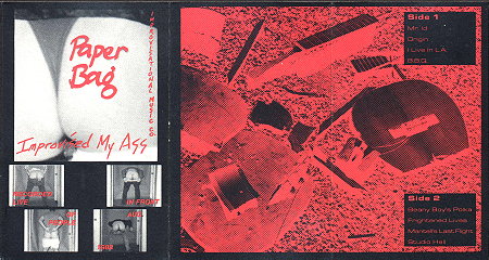 3. The cassette cover. The artwork wouldn't reduce properly to J-card size, so the cassette cover is significantly different- and not just in the art. M. decided to use a few select asses- particularly that belonging to a friend of mine, Cheryl. She'd insisted that the only way she was going to do the shot was if she could have the band's name written one of her cheeks. She's the only one that didn't actually moon- she's wearing a very skimpy thong instead- but considering that she's advertising for us, that was OK! M. went over the lettering actually in the photograph in red for the cover, so it looks like it was just put on afterwards. Nope- the red's just tracing what was actually written on her rear. And of course beneath it are tiny pictures of the 4 band members bowing before the camera. Small but certainly visible! Also as a special feature, M. wrote a short piece for the inside cover. Kenny had already left the band by the time this was done- he'd actually left before we'd even shot the back cover- and the feeling was in the air that we were coming to the end of our road together. It may not have been intended as a comment on that at all, but for me it makes this already effective short piece even more moving. It serves, ultimately, as a good epitaph for the band.
