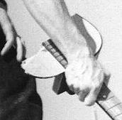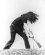 As for the back cover, it was actually a few months before we got around to that. Chris Gruenwedel, my girlfriend at the time, had been taking lots of pictures of the band and I felt she deserved a crack at it. (!) At this point, I'd been smashing acoustic guitars on stage for a while (click here for an article about that) and thought that might make a nice visual. M. agreed but didn't want an action shot- he wanted something impersonal, and so we were instructed to be sure to get a few shots of the debris after. So we did. I found a suitable instrument and on 2/25/89, Chris and I went out to Sepulveda Dam. She shot a whole sequence. M. then took a shot of the debris and turned it into an op-art expression.