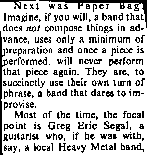 In Michelle's case, she saw us open for the Red Hot Chili Peppers at the Anti-Club one night in the summer of '85. She'd come to see them, and was instead completely taken with Paper Bag. This probably tells you much more about Michelle than us....Anyway, she started coming to rehearsals and recording sessions (she was present for some of both "Victimless Crime" and "Ticket To Trauma"), and being a freelance writer, she did pieces on us numerous times. Eventually, her association with the band became more friendly than professional, and her interests shifted from freelance writing to photography, enterprenuership, etc. She ended up taking the band photo on "Music To Trash", for example. Paper Bag performed an improvised wedding march when she married Richie Hass of Beatniks fame. The professional aspects have faded, the friendship continues to this day.
