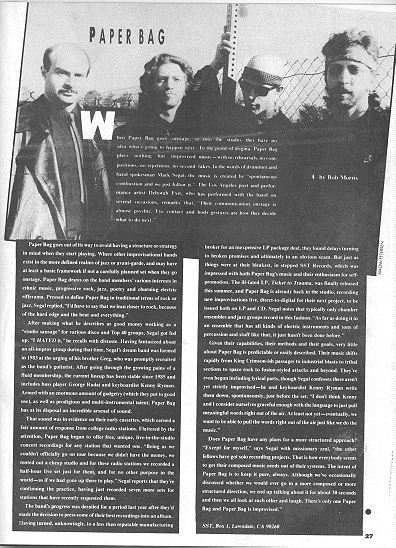 The band's progress was derailed for a period last year after they'd made the decision to press some of their best recordings into an album. Having turned, unknowingly, to a less than reputable manufacturing broker for an inexpensive LP package deal, they found delays turning to broken promises and ultimately to an obvious scam. But just as things were at their bleakest, in stepped SST Records, which was impressed with both Paper Bag's music and their enthusiasm for self-promotion. The ill-fated LP, Ticket To Trauma, was finally released this summer, and Paper Bag is already back in the studio, recording new improvisations live, direct-to-digital for their next project, to be issued both on LP and CD. Segal notes that typically only chamber ensembles and jazz groups record in this fashion." As far as doing it in an ensemble that has all kinds of electric instruments and tons of percussion and stuff llike that, it just hasn't been done before."