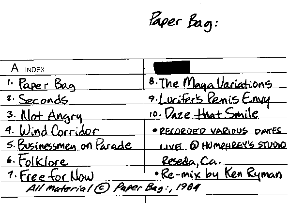 This is a sampler from the first two collections of recordings by the band from early '84, neither of which are currently in my possession. (I'm also not sure if those were ever given covers, or if they were just sent out with song titles as in the listing above.) It features lineup E: Greg Segal- guitar, effects, organ, bass; M. Segal- drums and percussion; Ken Rosser- guitar, effects, bass; and Bruce Heubner- saxaphones, flute and oboe. No vocals/poetry just yet.