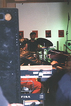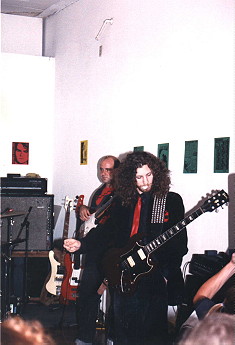 Placed side by side, this gives an approximate idea of the stage set-up. There may appear to be a fair amount of space not shown between the two shots- not so. It appears that way because both pictures were taken from side angles. We actually weren't much farther apart than this- Be-Bop was narrow and long, the stage area being the width of the room. The audience was seated, or stood, the length of the room. Richard Bruland, who owned and operated Be-Bop, allowed us to remove the records and bins and haul it all back to the band house, up the street, leaving room to pack lots and lots of people in. It was a very memorable experience and one of the band's best shows. Songs from this show that ended up on the LP: "Mr. Id"; "Origin"; "I Live In L.A."; "B.B.Q."; and "Mantell's Last Flight".