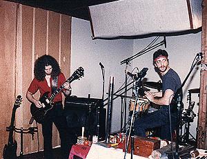 Again, these pictures were taken with a flash, and they make the room look very bright, which it never was- it was dark and atmospheric. (I saw many details of Spinhead illuminated for the first time when these were developed. Here we'd been there every night for a month doing "Music To Trash", and for about a week during "A Land Without Fences"; and until I saw these shots I could never tell what color the back wall was.) And this was a very unusual set up for us, all packed against the back wall- normally we arranged ourselves in a circle facing each other: M. against the back wall, me against the front wall with my back to the door and the recording booth window, George to the right and Kenny to the left. After which of course you could barely walk in and out of the place, especially once the sound baffles went up. But this time we needed room for an audience, so...we all brought a lot less (yes, believe it or not, this was light for us). I didn't even bring the pedalboard- guitar and amp, period. I thought it would be a nice challenge to make Paper Bag music without it. Songs from this session that made the album: "Frightened Lives" and "Studio Hell".